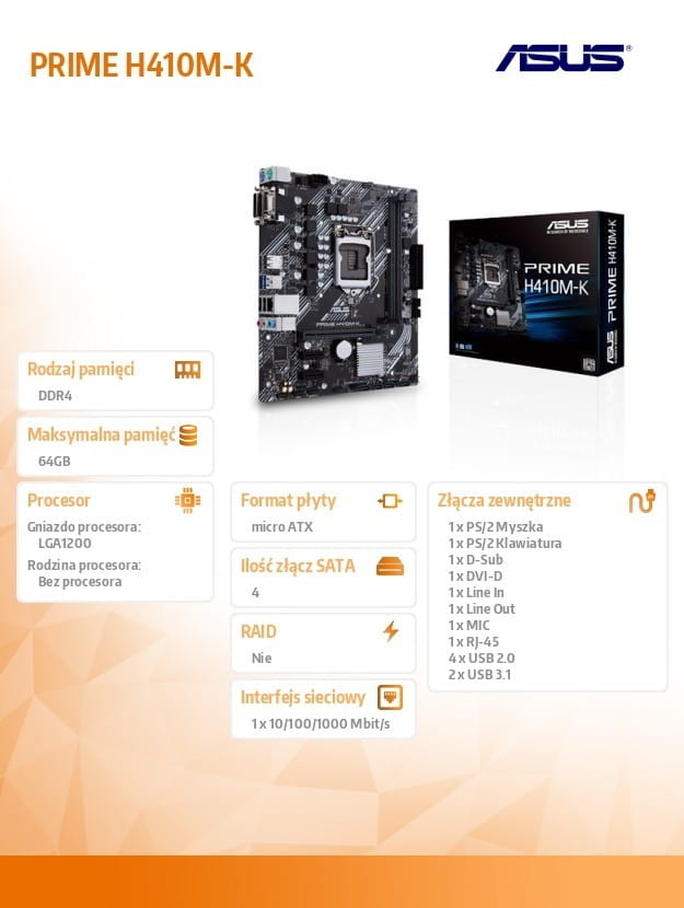 Seria ASUS Prime została profesjonalnie zaprojektowana, aby uwolnić pełny potencjał procesorów Intel Core 10. generacji. Oferując solidną konstrukcję zasilania, kompleksowe rozwiązania chłodzące i inteligentne opcje dostrajania, płyty główne z serii Prime H410 zapewniają codziennym użytkownikom i twórcom komputerów osobistych szereg opcji dostrajania wydajności za pomocą dołączonego oprogramowania i sprzętu.