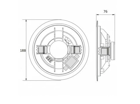 Instalacja głośnika w suficie podwieszanym przebiega wyjątkowo sprawnie dzięki zastosowaniu zacisku sprężynowego. Głośnik wystarczy wsunąć w przygotowane wycięcie montażowe o średnicy 165 mm solidne klamry ze sprężyną automatycznie zablokują obudowę w odpowiednim położeniu, zapewniając stabilność i pewność mocowania bez wkręcania ani jednej śruby.