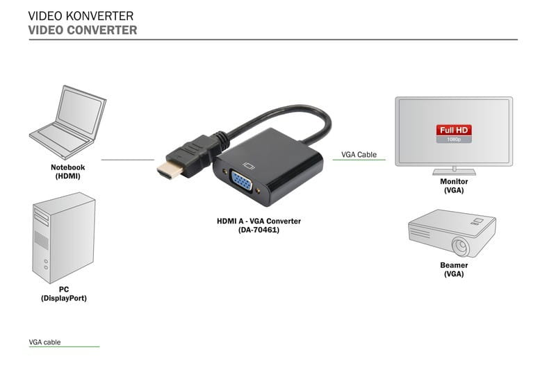 Dzięki temu można połączyć nowoczesne urządzenia odtwarzające, takie jak notebooki, odtwarzacze Blue Ray, odtwarzacze DVD, konsole do gry itd., ze starszymi ekranami VGA lub rzutnikami komputerowymi VGA. Konwerter posiada dodatkowo gniazdo audio mini jack 3,5 mm. Dzięki temu następuje równoczesna konwersja ewentualnego sygnału audio. Umożliwia to dodatkowe odtwarzanie audio po podłączeniu głośników lub systemu surround.