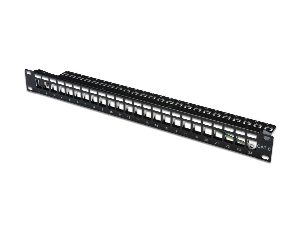 Digitus Panel krosowy (patch panel) modularny 19" 24 porty pod moduły keystone, 1U, ekranowany, prowadnica kabli, pola opisowe, czarny