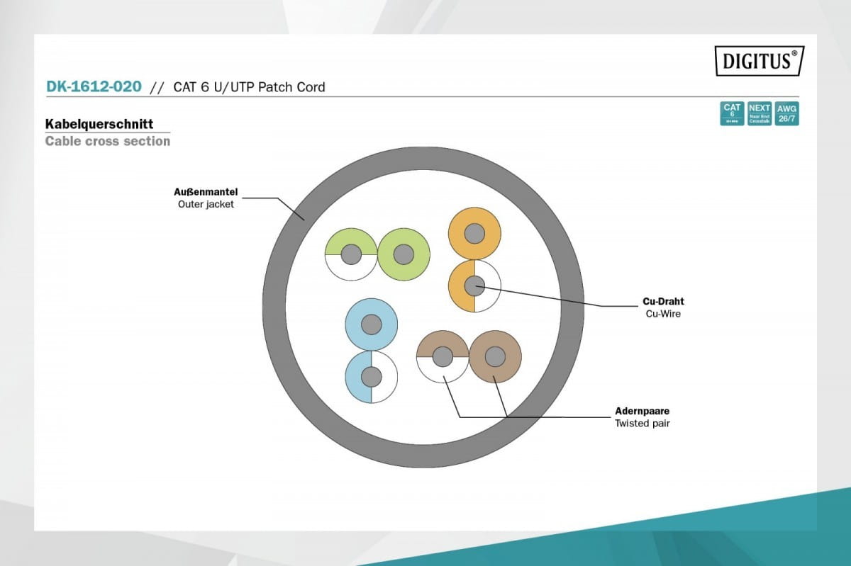 Pozostałe parametry: Osłony z odgiętką, odciążką i zabezpieczeniem zapadki Oznaczenia długości na osłonce Asortyment: Kable krosowe skrętkowe Konfiguracja par: 1:1 Opakowanie: Torebka foliowa DIGITUS Złącze 1: Modułowa wtyczka RJ45 (8/8) Złącze 2: Modułowa wtyczka RJ45 (8/8) Typ ekranowania: U-UTP, nieekranowany Konstrukcja kabla: 4 x 2 AWG 26/7, skrętka Powłoka: PVC