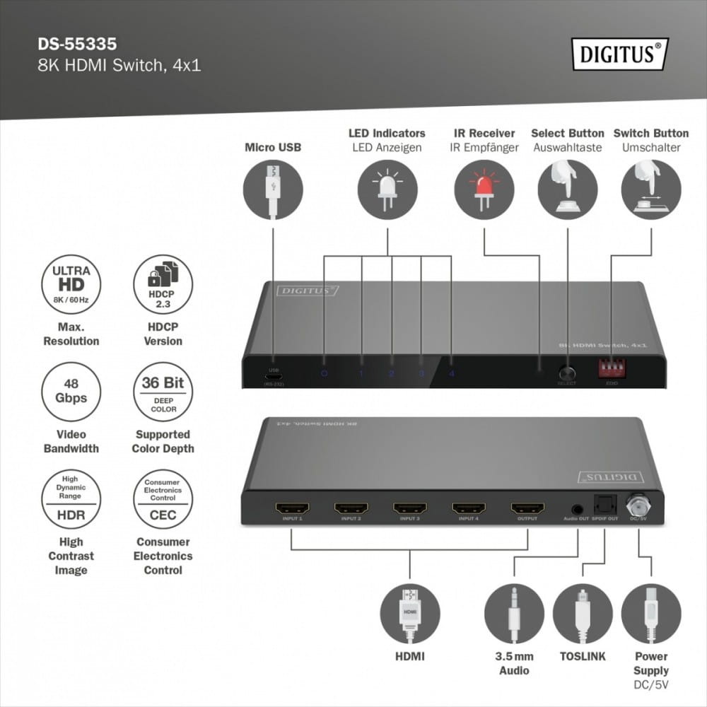 Przełącznik DIGITUS 8K HDMI Switch, 4x1 oferuje dodatkowe złącza HDMI dla wyświetlacza wyjściowego - 4 źródła sygnału można podłączyć do ekranu za pomocą 1 złącza HDMI. Sygnały audio można również oddzielić za pomocą złącza Toslink lub 3,5 mm stereo i odtwarzać oddzielnie. Wygodne przełączanie między źródłami sygnału za pomocą pilota zdalnego sterowania, na samym urządzeniu lub poprzez automatyczne wykrywanie.