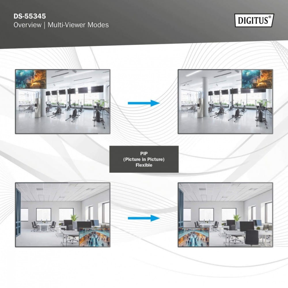 Przełącznik matrycowy DIGITUS HDMI 4 x 2 / Quad Multi-Viewer umożliwia wygodne przełączanie pomiędzy maksymalnie 4 źródłami sygnału HDMI i 2 urządzeniami odtwarzającymi. Dzięki temu możesz rozdzielać swoje treści multimedialne w sposób niezależny. Możliwe jest wygodne przełączanie pomiędzy źródłami sygnału za pomocą pilota zdalnego sterowania, bezpośrednio na urządzeniu lub za pomocą sterowania RS232. Funkcja multiviewer zapewnia 6 trybów do indywidualnego wyświetlania poszczególnych źródeł sygnału (podzielony ekran, obraz w obrazie PIP) na wyjściu A albo na wyjściach A i B równolegle. Sygnały audio można również wydzielić za pomocą złącza Toslink lub złącza stereo 3,5 mm i odtwarzać osobno. Obsługiwane są rozdzielczości do 4K / 30 Hz. Rozdzielczość wyjściową HDMI można indywidualnie ustawiać za pomocą skalera.