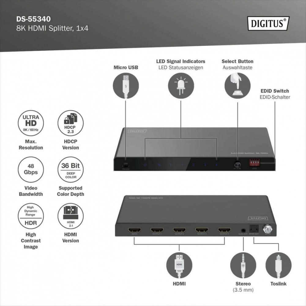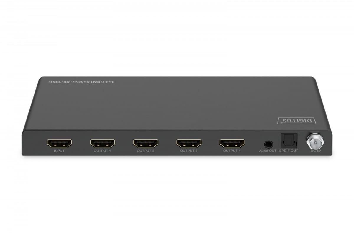 Rozdzielacz HDMI firmy DIGITUS dystrybuuje/odbija sygnały audio i wideo z urządzenia HDMI do 4 telewizorów, monitorów lub projektorów w rozdzielczości UHD 8K/60Hz. Sygnały audio można również oddzielić za pomocą złącza Toslink lub 3,5 mm stereo i odtwarzać je oddzielnie. Przełącznik EDID może być używany do wprowadzania ustawień dopasowanych do podłączonych wyświetlaczy.
