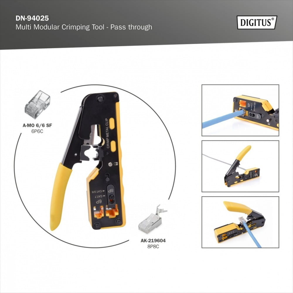 Digitus Zaciskarka do wtyków przelotowych RJ45 kat.5e/kat.6, RJ12, RJ11 z funkcją obcinania kabli oraz ściągania izolacji
