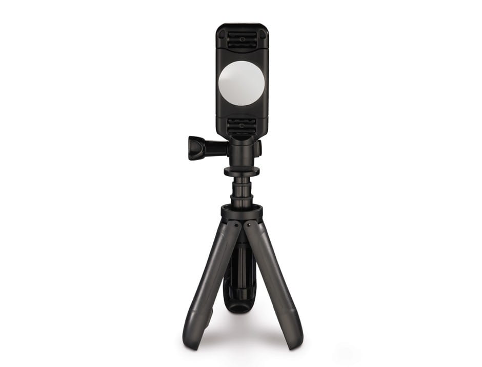 Kieszonkowy statyw do smartfonów znacząco ułatwia robienie stabilnych selfie oraz nagrywanie filmów. Lusterko umożliwia robienie ujęć również tylnym aparatem.
