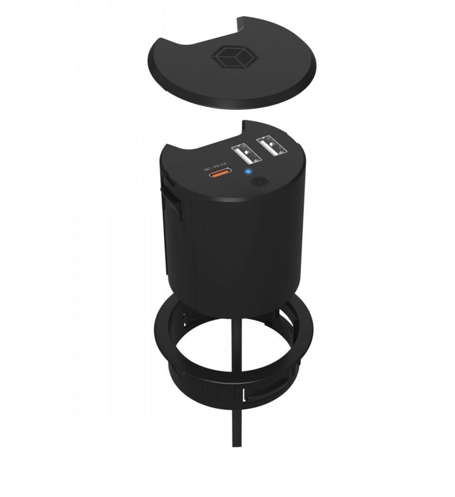 IcyBox IB-HUB1407 3 Port ładowarka do biurka, 2x USB-A, 1x USB-C, otwór 60mm