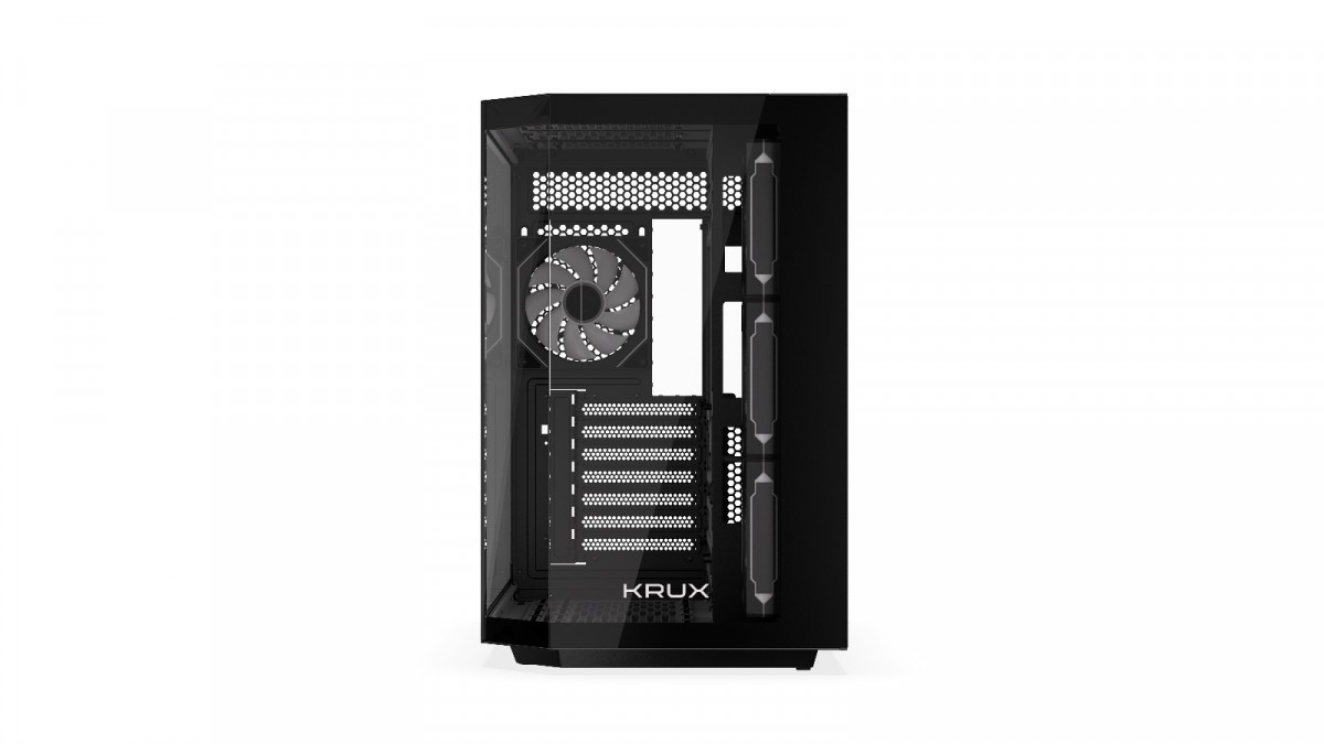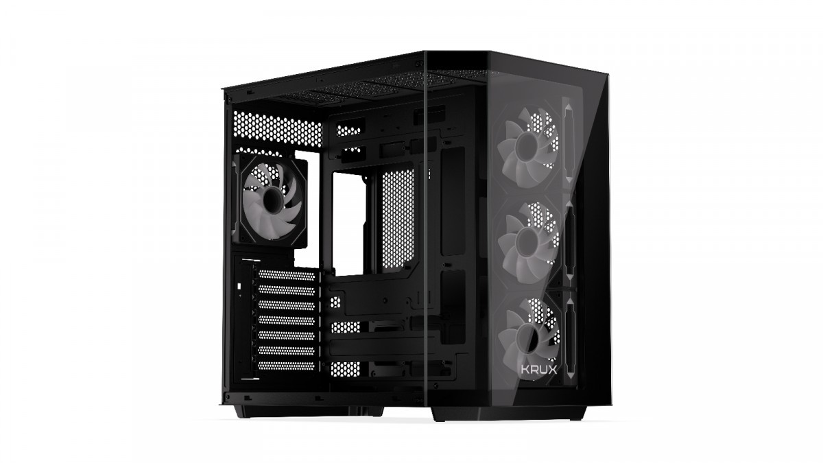 W obudowie Krux Empero zmieścisz podzespoły, takie jak pełnowymiarowe płyty główne ATX (lub mniejsze microATX i mini-ITX), karty graficzne o długości do 420 mm, wieżowe chłodzenie procesora o wysokości do 155 mm, zasilacze o długości do 205 mm, do 5 dysków oraz chłodnice AiO o długości 120, 240, 280, a nawet 360 mm. Domyślnie zamontowany zestaw 4 wentylatorów 120 mm możesz poszerzyć maksymalnie do 10 sztuk.