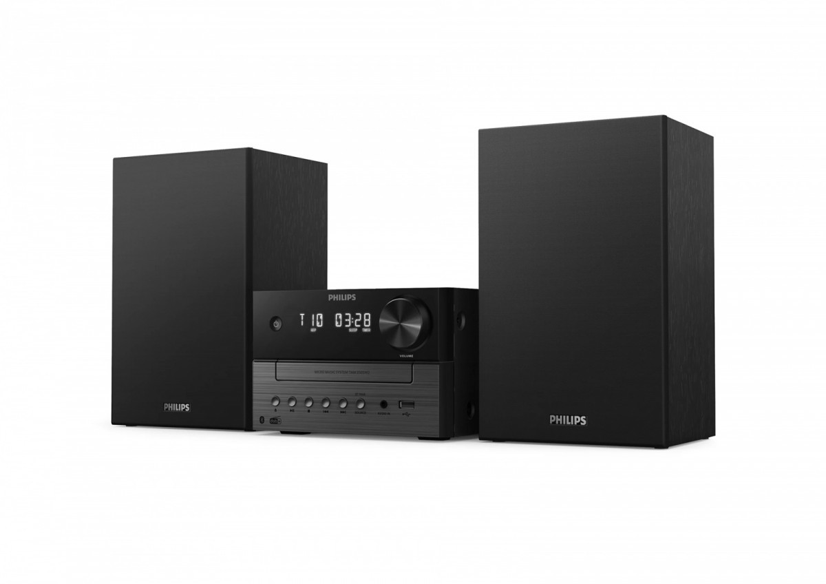 Dzięki subtelnie dwukolorowej jednostce centralnej i obudowom głośników, ta elegancka mikrowieża przypomina wzornictwo klasycznych urządzeń hi-fi. Kompaktowa konstrukcja sprawia, że łatwo jest znaleźć dla niej miejsce w domu, a z przodu urządzenia znajdują się przyciski do odtwarzania i wyboru źródła.