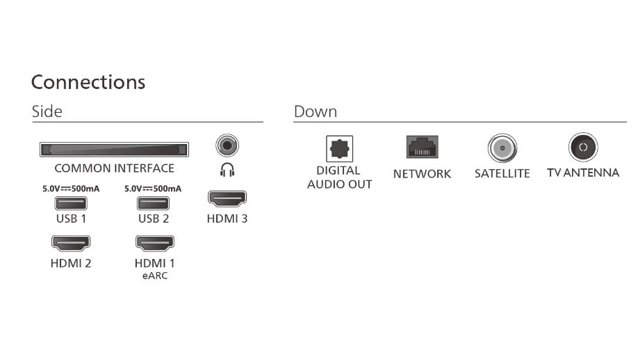 Gniazda we/wy: 1 x 3,5 mm minijack, 3 x HDMI, 2 x USB 2.0, 1 x RJ-45 LAN, 1 x Audio out, 1 x Gniazdo CI/Cl+, 1 x Wejście antenowe, 1 x Satellite