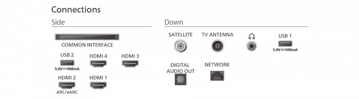 Gniazda we/wy: 1 x 3,5 mm minijack, 4 x HDMI, 2 x USB 2.0, 1 x RJ-45 LAN, 1 x SPDIF out, 1 x Gniazdo CI/Cl+, 1 x Wejście antenowe, 1 x Satellite