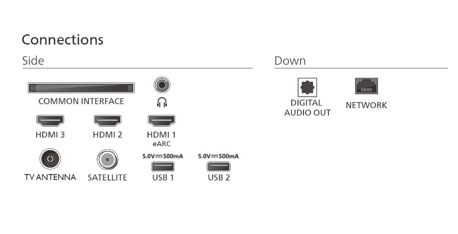 Gniazda we/wy: 3 x HDMI, 1 x 3,5 mm minijack, 2 x USB 2.0, 1 x Satellite, 1 x Wejście antenowe, 1 x Gniazdo CI/Cl+, 1 x Audio out, 1 x RJ-45 LAN