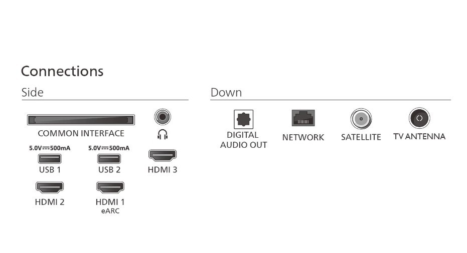 Gniazda we/wy: 3 x HDMI, 2 x USB 2.0, 1 x Satellite, 1 x Wejście antenowe, 1 x Gniazdo CI/Cl+, 1 x Audio out, 1 x RJ-45 LAN, 1 x 3,5 mm minijack