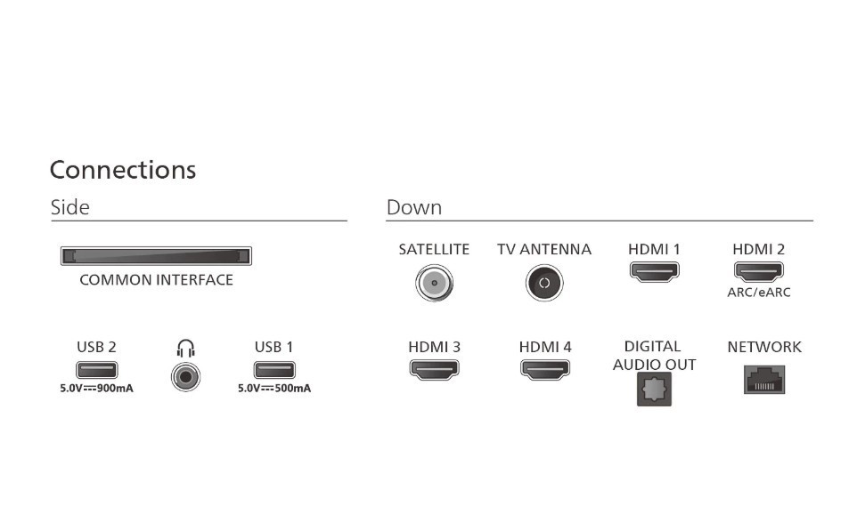Gniazda we/wy: 1 x Satellite, 1 x RJ-45 LAN, 1 x Audio out, 1 x Gniazdo CI/Cl+, 1 x Wejście antenowe, 4 x HDMI, 2 x USB 2.0, 1 x 3,5 mm minijack