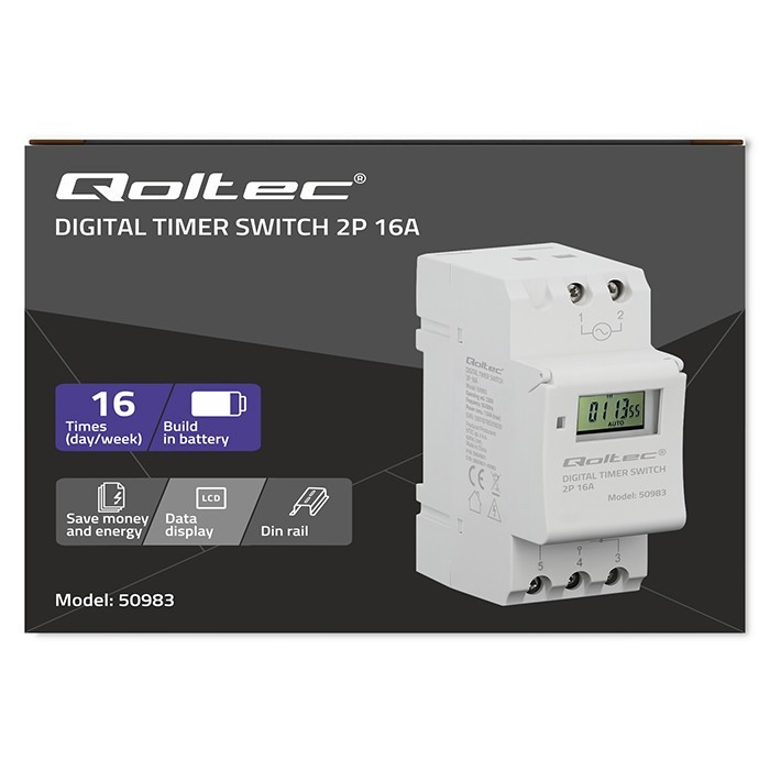 Qoltec Elektroniczny programator czasowy TIMER na szynę DIN z wbudowaną baterią | harmonogram 7 dni | 16 programów