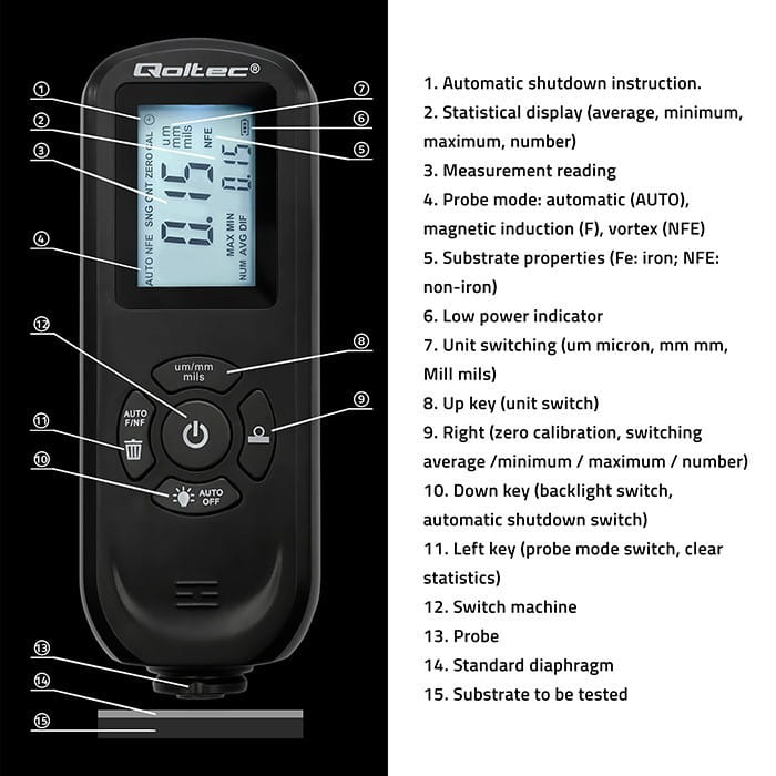Qoltec Miernik grubości lakieru z podświetlanym bocznym wyświetlaczem LCD | 0 ~ 2000um