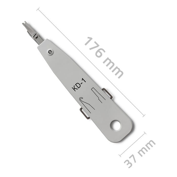Końcówka uderzeniowa noża krosowniczego jest wyprodukowana z hartowanej stali, co gwarantuje nie tylko trwałość, ale także precyzyjność w procesie wbijania żył kabli do zacisków. Obudowa wykonana jest z tworzywa ABS, co dodatkowo zwiększa trwałość narzędzia i zapewnia komfort użytkowania w różnych warunkach pracy. Dodatkową cechą ułatwiającą pracę z nożem krosowniczym są dwa wysuwane elementy umieszczone z boku urządzenia. Te elementy znacznie ułatwiają przepychanie i wyciąganie kabli, co przekłada się na wygodę użytkowania i skrócenie czasu potrzebnego do instalacji.