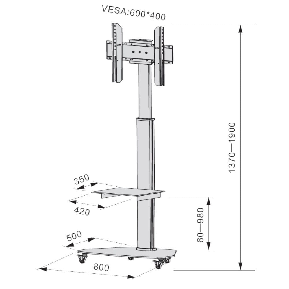 Wymiary: Podstawa: 800 x 500 mm Kolumna teleskopowa: 1370-1900 mm Półka: 420 x 350 mm